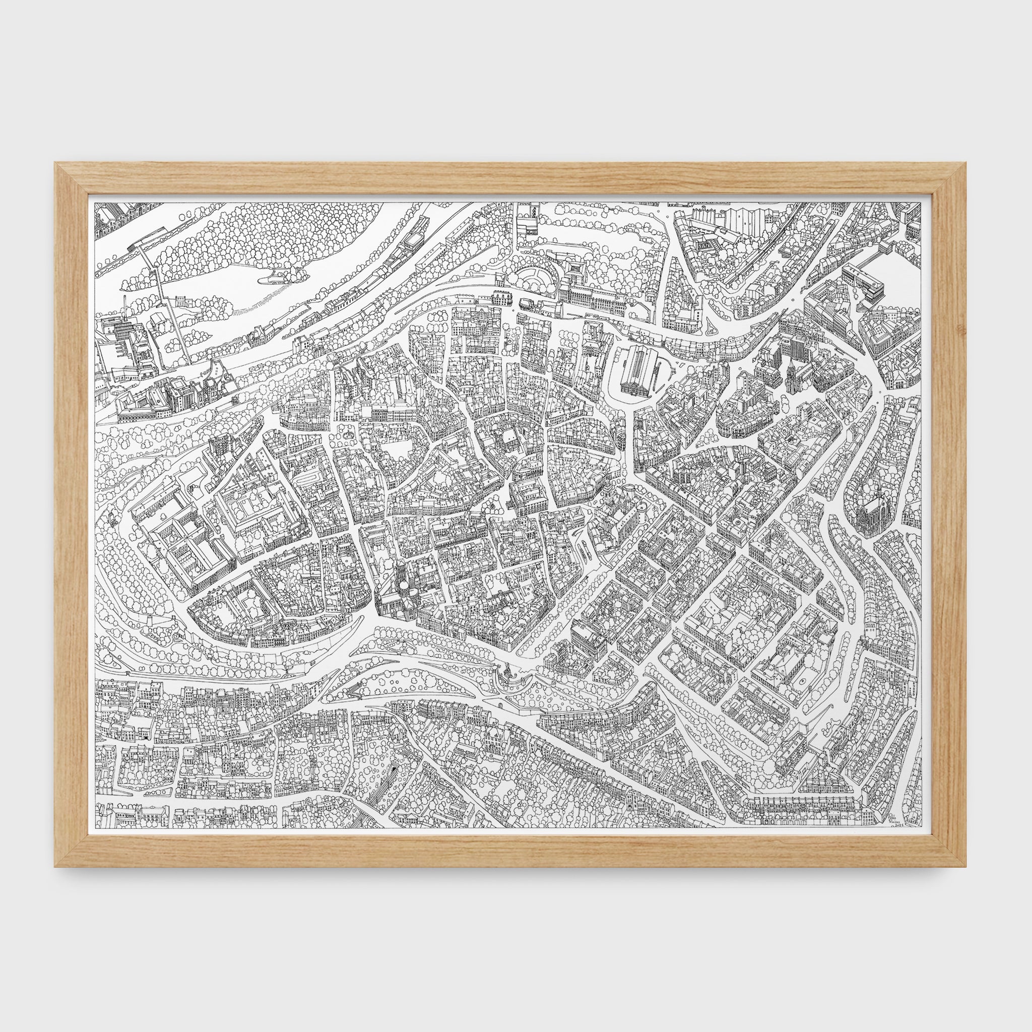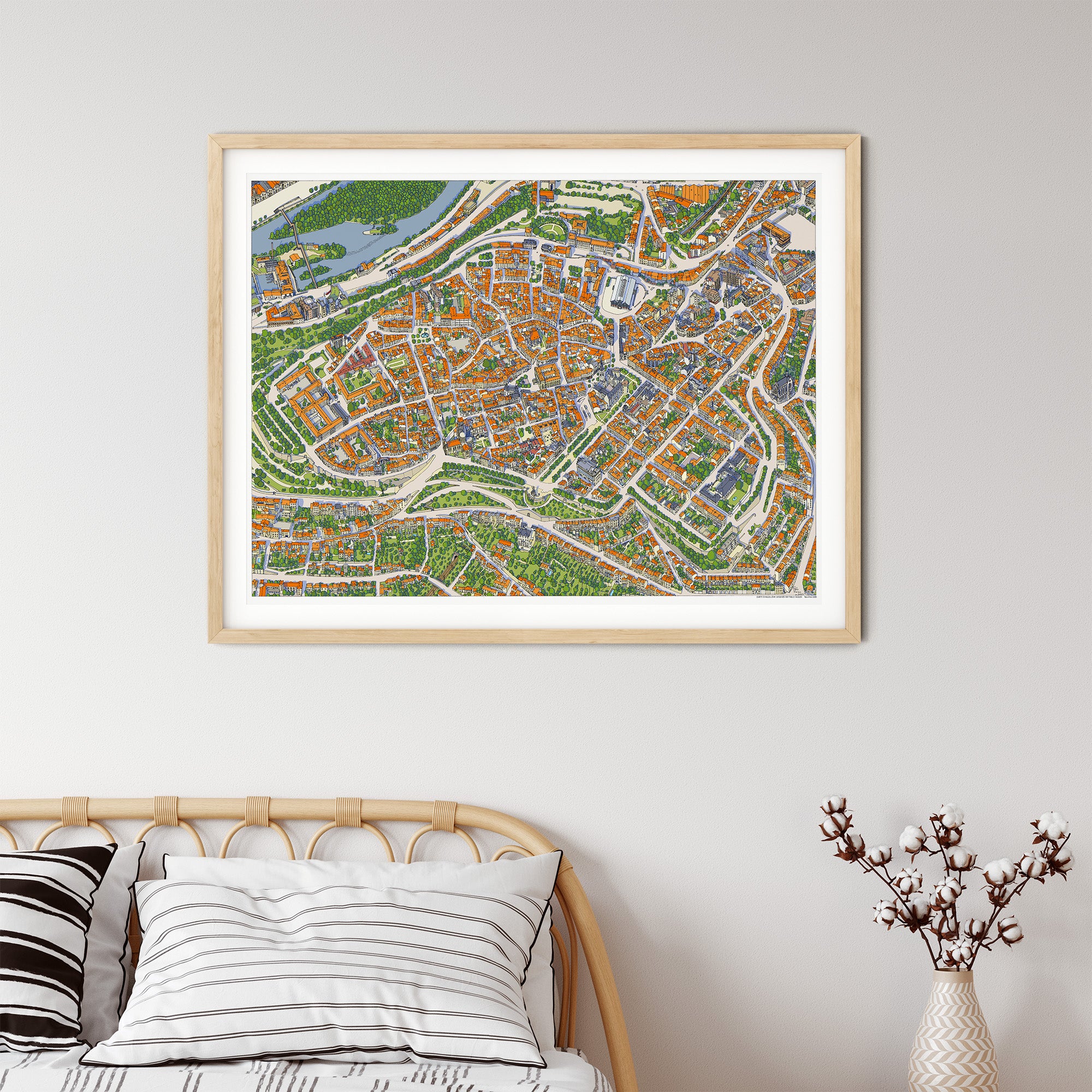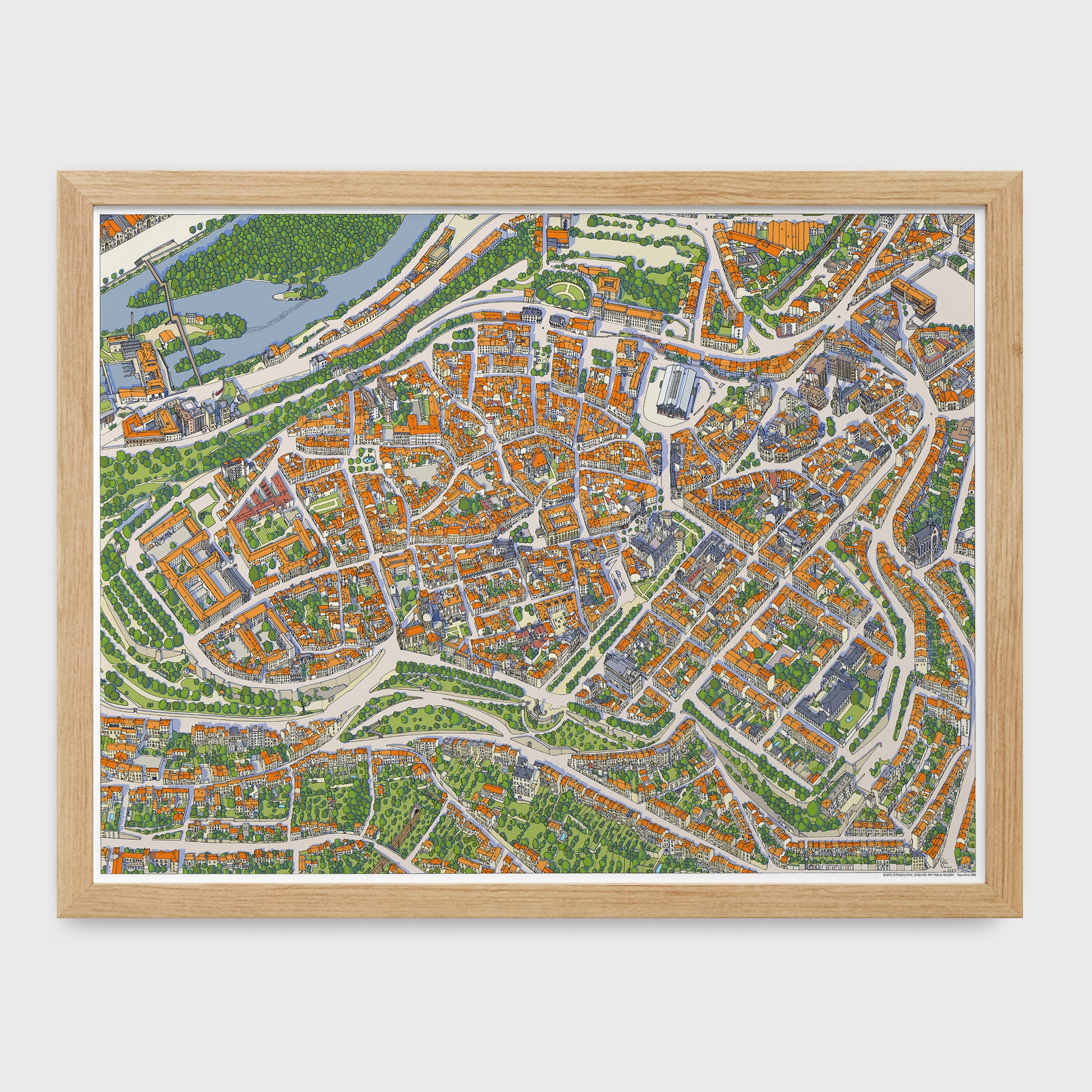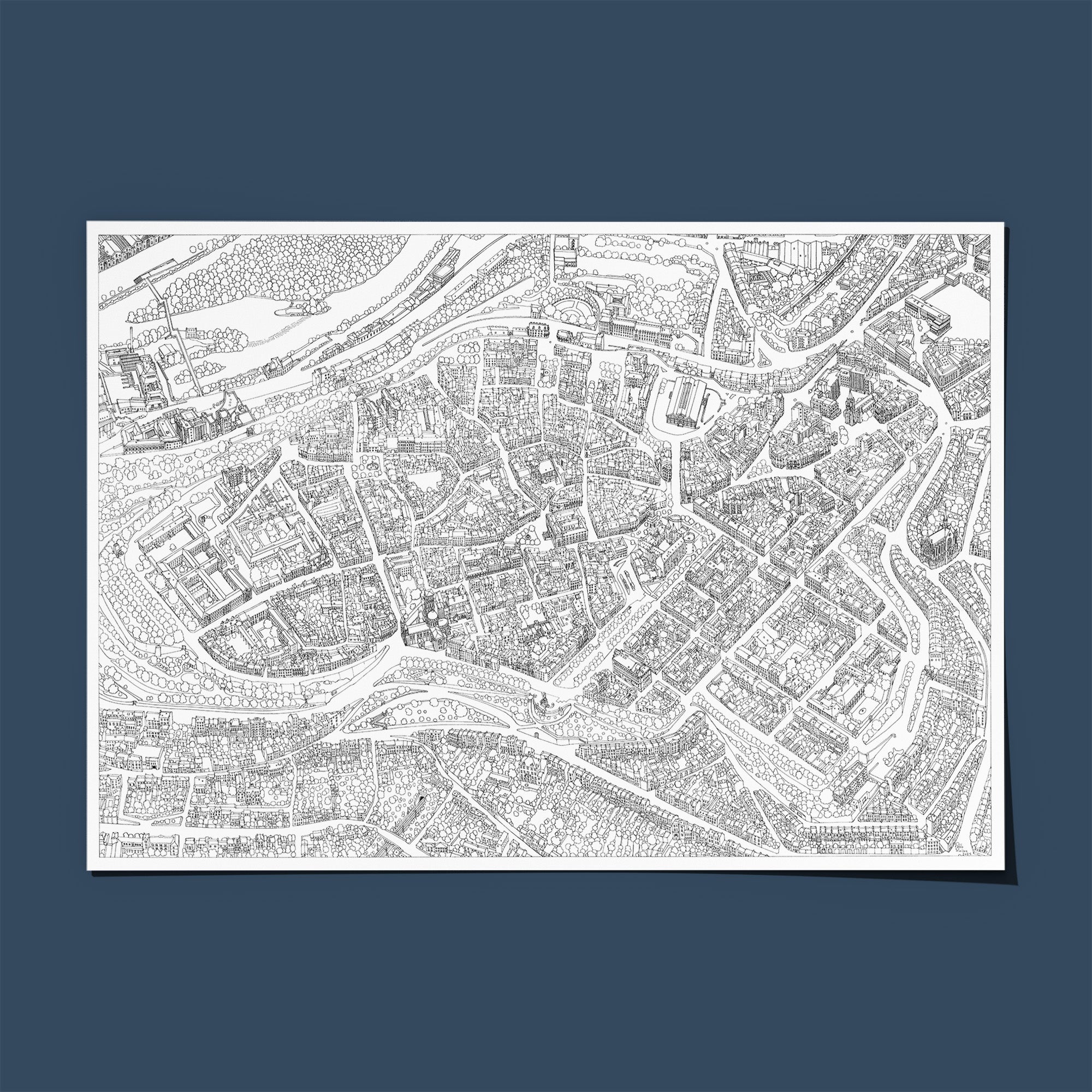Carte de la ville d'Angoulême dessinée à la main, à l'encre de Chine et coloriée par Pablo Raison en 2025.