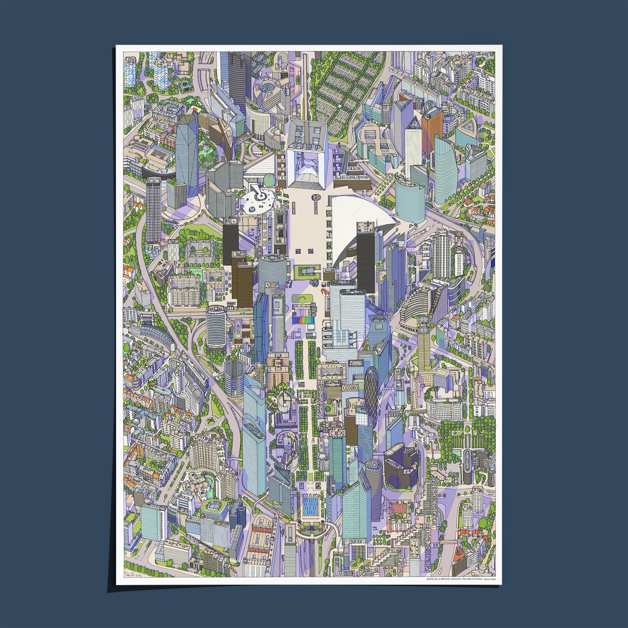 Plan du quartier de la Défense dessiné à la main, à l'encre de Chine et coloriée par Pablo Raison en 2026.